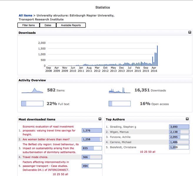 The first shot shows the research unit (TRi) time profiles of downloads and the top 5 dowloaded papers (mine is actually an AUSTROADS Australian report, which was downloaded more from here than from anywhere else)